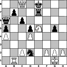 Partie-Notation im PGN-Format [Event "Herbstman"] [Site "www.mySchach.de"] [Date "2015.11.01"] [Round "1"] [White "Schefsche"] [Black "alpacino"] [ECO "B01"] [WhitemyELO "1493"] [BlackmyELO "1287"] [Result "1-0"] [TimeControl "10/2592000"] [WhiteDays "30"] [BlackDays "30"] [MySchachNr "101034"] 1. e4 d5 2. e5 e6 3. Nf3 h6 4. d4 Nc6 5. Bb5 Bd7 6. Bxc6 Bxc6 7. Bd2 Ne7 8. O-O Nf5 9. a3 Qe7 10. Bb4 Qd7 11. Bxf8 Rxf8 12. Nc3 O-O-O 13. b4 Kb8 14. Qe2 a6 15. a4 Kc8 16. b5 a5 17. bxc6 Qxc6 18. Nb5 Kb8 19. Qd2 Qa6 20. Rfb1 c6 21. Nd6 Rxd6 22. exd6 Nxd6 23. Ne5 Kc8 24. Ra3 Kd8 25. Qf4 g5 26. Qf6+ Ke8 27. Qxh6 Ne4 28. Rf3 Nd2 29. Rxf7 Rxf7 30. Qxe6+ Re7 31. Qc8# 1-0 Stellungs-Notation im FEN-Format 2Q1k3/1p2r3/q1p5/p2pN1p1/P2P4/8/2Pn1PPP/1R4K1 - - - 2 31 Geschlagene Figuren Weiss: Geschlagene Figuren Schwarz: Klicken Sie auf eine geschlagene Figur um den gewünschten Zug darzustellen!