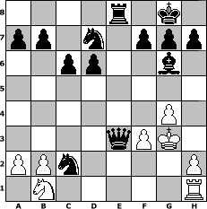 Partie-Notation im PGN-Format [Event "Pott Schach - Glück Auf die xte."] [Site "www.mySchach.de"] [Date "2020.11.05"] [Round "1"] [White "Haneken"] [Black "faustballer"] [ECO "C41"] [WhitemyELO "1126"] [BlackmyELO "1547"] [Result "0-1"] [TimeControl "10/2592000"] [WhiteDays "89"] [BlackDays "90"] [MySchachNr "119739"] 1. e4 e5 2. Nf3 d6 3. d4 exd4 4. Nxd4 Be7 5. Bb5+ c6 6. Ba4 Nf6 7. Qe2 O-O 8. Qf3 Re8 9. Qg3 Nxe4 10. Qf4 Nc5 11. Bb3 Bg5+ 12. Ne6 Nxe6 13. Qf3 Nd4+ 14. Qe2 Rxe2+ 15. Kd1 Bxc1 16. Kxc1 Nxb3+ 17. Kd1 Nxa1 18. Kxe2 Nxc2 19. Kd2 Bf5 20. f3 Qg5+ 21. Ke2 Nd7 22. g4 Re8+ 23. Kf2 Qe3+ 24. Kg3 Bg6 0-1 Stellungs-Notation im FEN-Format 4r1k1/pp1n1ppp/2pp2b1/8/6P1/4qPK1/PPn4P/1N5R - - - 5 25 Geschlagene Figuren Weiss: Geschlagene Figuren Schwarz: Klicken Sie auf eine geschlagene Figur um den gewünschten Zug darzustellen!