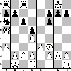 | Partie-Notation im PGN-Format [Event "12. HK-Turnier"] [Site "www.mySchach.de"] [Date "2010.08.16"] [Round "2"] [White "Master1"] [Black "Steppenwolf"] [ECO "D02"] [WhitemyELO "1359"] [BlackmyELO "1085"] [Result "1-0"] [TimeControl "10/2592000"] [WhiteDays "25"] [BlackDays "28"] [MySchachNr "67676"] 1. d4 d5 2. Nf3 Nf6 3. Nc3 c6 4. Bg5 Bf5 5. Bxf6 exf6 6. e3 Bb4 7. Bd3 Bxd3 8. Qxd3 O-O 9. O-O-O Qa5 10. Kb1 Na6 11. a3 Bxc3 12. Qxc3 Rfc8 13. Qxa5 1-0 Stellungs-Notation im FEN-Format r1r3k1/pp3ppp/n1p2p2/Q2p4/3P4/P3PN2/1PPP1PPP/1K1R3R - - - 0 13 Geschlagene Figuren Weiss:                              Geschlagene Figuren Schwarz:                               Klicken Sie auf eine geschlagene Figur um den gewünschten Zug darzustellen!