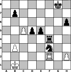 Partie-Notation im PGN-Format [Event ""Freibier f"] [Site "www.mySchach.de"] [Date "2005.05.27"] [Round "1"] [White "bane"] [Black "Hondo"] [ECO "A45"] [WhitemyELO "1767"] [BlackmyELO "1930"] [Result "0-1"] [TimeControl "10/1728000"] [WhiteDays "80"] [BlackDays "80"] [MySchachNr "13648"] 1. d4 Nf6 2. c3 d5 3. Nf3 c5 4. dxc5 e6 5. b4 a5 6. Bg5 axb4 7. cxb4 Nc6 8. Qd2 h6 9. Bh4 g5 10. Bg3 Bg7 11. Qb2 O-O 12. e3 Ne4 13. Nd4 f5 14. Na3 f4 15. f3 fxe3 16. Nac2 Nf2 17. Rg1 Bxd4 18. Nxd4 Qf6 19. Bxf2 Nxd4 20. O-O-O exf2 21. Rh1 Qf4+ 22. Kb1 e5 23. Bd3 Bf5 24. Qd2 Ra4 25. Qxf4 Bxd3+ 26. Rxd3 Rxb4+ 27. Rb3 Rxb3+ 28. axb3 Rxf4 29. Rf1 g4 30. Rxf2 gxf3 31. gxf3 Nxf3 0-1 Stellungs-Notation im FEN-Format 6k1/1p6/7p/2Ppp3/5r2/1P3n2/5R1P/1K6 - - - 0 32 Geschlagene Figuren Weiss: Geschlagene Figuren Schwarz: Klicken Sie auf eine geschlagene Figur um den gewünschten Zug darzustellen!