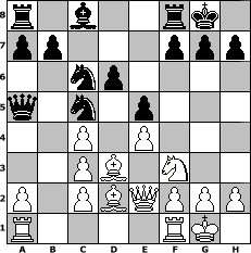 Partie-Notation im PGN-Format [Event "MN-2012-1"] [Site "www.mySchach.de"] [Date "2012.07.24"] [Round "1"] [White "spiderman"] [Black "pepo47"] [ECO "A30"] [WhitemyELO "1737"] [BlackmyELO "2035"] [Result "0-1"] [TimeControl "10/2592000"] [WhiteDays "23"] [BlackDays "28"] [MySchachNr "82924"] 1. c4 c5 2. d4 cxd4 3. Qxd4 Nc6 4. Qd1 Nf6 5. Nc3 e5 6. e4 Bb4 7. Bd3 Bxc3+ 8. bxc3 d6 9. Nf3 O-O 10. O-O Qa5 11. Bd2 Nd7 12. Qe2 Nc5 0-1 Stellungs-Notation im FEN-Format r1b2rk1/pp3ppp/2np4/q1n1p3/2P1P3/2PB1N2/P1PBQPPP/R4RK1 - - - 8 13 Geschlagene Figuren Weiss: Geschlagene Figuren Schwarz: Klicken Sie auf eine geschlagene Figur um den gewünschten Zug darzustellen!