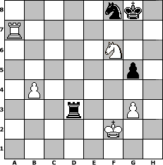 Partie-Notation im PGN-Format [Event "Rechnerfrei A"] [Site "www.mySchach.de"] [Date "2010.02.05"] [Round "1"] [White "hape50"] [Black "Steppenwolf"] [ECO "D00"] [WhitemyELO "1276"] [BlackmyELO "1245"] [Result "1-0"] [TimeControl "10/1728000"] [WhiteDays "80"] [BlackDays "36"] [MySchachNr "62916"] 1. d4 d5 2. e3 Nc6 3. h3 Nf6 4. Nf3 Bf5 5. Bd3 Bxd3 6. Qxd3 e6 7. Nc3 Bb4 8. Bd2 O-O 9. a3 Ba5 10. e4 Re8 11. O-O dxe4 12. Nxe4 Nxe4 13. Bxa5 Nxa5 14. Qxe4 Nc6 15. h4 Qd7 16. Ng5 f5 17. Qd3 Qxd4 18. Qxd4 Nxd4 19. c3 Ne2+ 20. Kh2 e5 21. Rae1 Nf4 22. Rd1 Rad8 23. g3 Rxd1 24. Rxd1 e4 25. Rd7 e3 26. fxe3 Ng6 27. Rxc7 Rxe3 28. Rc8+ Nf8 29. b4 h6 30. Nh3 Re2+ 31. Kg1 Re1+ 32. Kf2 Ra1 33. Rb8 Rxa3 34. Rxb7 Rxc3 35. Rxa7 f4 36. Nxf4 g5 37. hxg5 hxg5 38. Nd5 Rd3 39. Nf6+ 1-0 Stellungs-Notation im FEN-Format 5nk1/R7/5N2/6p1/1P6/3r2P1/5K2/8 - - - 3 39 Geschlagene Figuren Weiss: Geschlagene Figuren Schwarz: Klicken Sie auf eine geschlagene Figur um den gewünschten Zug darzustellen!