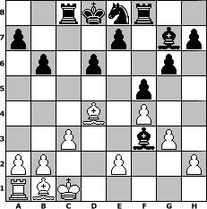 Partie-Notation im PGN-Format [Event "5. HK-960-Pokal"] [Site "www.mySchach.de"] [Date "2012.09.11"] [Round "1"] [White "Haki"] [Black "ChristinaH"] [Variant "Fischerrandom"] [SetUp "1"] [FEN "rbbknnqr/pppppppp/8/8/8/8/PPPPPPPP/RBBKNNQR w KQkq - 0 1"] [WhitemyELO "1320"] [BlackmyELO "1522"] [Result "0-1"] [TimeControl "10/1728000"] [WhiteDays "20"] [BlackDays "20"] [MySchachNr "83864"] 1. e4 Ne6 2. Nf3 c6 3. d4 b6 4. g3 g6 5. Be3 f5 6. e5 c5 7. d5 Nd4 8. Nxd4 cxd4 9. Bxd4 Qxd5 10. c3 Qf3+ 11. Kc1 Bb7 12. Nd2 Qxh1 13. f3 Qxg1+ 14. Bxg1 Bxe5 15. f4 Bg7 16. Nc4 Rc8 17. Ne5 Rf8 18. Bd4 d6 19. Nf3 Bxf3 0-1 Stellungs-Notation im FEN-Format 2rknr2/p3p1bp/1p1p2p1/5p2/3B1P2/2P2bP1/PP2P2P/RBK5 - - - 0 20 Geschlagene Figuren Weiss: Geschlagene Figuren Schwarz: Klicken Sie auf eine geschlagene Figur um den gewünschten Zug darzustellen!