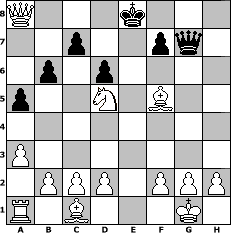 Partie-Notation im PGN-Format [Event "Spa"] [Site "www.mySchach.de"] [Date "2009.09.15"] [Round "1"] [White "babikar"] [Black "Hobbykegler"] [ECO "C44"] [WhitemyELO "1262"] [BlackmyELO "1059"] [Result "1-0"] [TimeControl "10/2592000"] [WhiteDays "30"] [BlackDays "30"] [MySchachNr "59062"] 1. e4 e5 2. Nf3 Nc6 3. a3 Nf6 4. Bc4 Nxe4 5. O-O Bc5 6. Qe2 Nd6 7. Nxe5 Nxe5 8. Qxe5+ Qe7 9. Qxg7 Qf8 10. Qe5+ Kd8 11. Qf6+ Ke8 12. Re1+ Ne4 13. Rxe4+ Be7 14. Rxe7+ Qxe7 15. Qxh8+ Qf8 16. Qxh7 d6 17. Nc3 b6 18. Qe4+ Kd8 19. Qxa8 a5 20. Ba6 Ke7 21. Bxc8 Qg7 22. Nd5+ Ke8 23. Bf5# 1-0 Stellungs-Notation im FEN-Format Q3k3/2p2pq1/1p1p4/p2N1B2/8/P7/1PPP1PPP/R1B3K1 - - - 4 23 Geschlagene Figuren Weiss: Geschlagene Figuren Schwarz: Klicken Sie auf eine geschlagene Figur um den gewünschten Zug darzustellen!