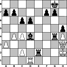 Partie-Notation im PGN-Format [Event "Oktoberfest"] [Site "www.mySchach.de"] [Date "2011.10.06"] [Round "1"] [White "ChessFan98"] [Black "werderfan"] [ECO "A20"] [WhitemyELO "1500"] [BlackmyELO "1450"] [Result "0-1"] [TimeControl "10/2592000"] [WhiteDays "79"] [BlackDays "87"] [MySchachNr "76648"] 1. c4 e5 2. g3 c6 3. Bg2 Bc5 4. Nc3 Nf6 5. d3 O-O 6. Bg5 h6 7. Bxf6 Qxf6 8. Nf3 d6 9. O-O Bg4 10. Ne4 Nd7 11. Nxf6+ Nxf6 12. a3 e4 13. dxe4 Nxe4 14. h3 Bxf2+ 15. Kh1 Nxg3+ 16. Kh2 Nxf1+ 17. Qxf1 Bxf3 18. Bxf3 Bd4 19. Rb1 Rae8 20. Qg2 Re5 21. b4 Rg5 22. Bg4 h5 23. h4 Rxg4 24. Qh3 Re8 25. Rd1 Rxe2+ 0-1 Stellungs-Notation im FEN-Format 6k1/pp3pp1/2pp4/7p/1PPb2rP/P6Q/2P1r2K/3R4 - - - 0 26 Geschlagene Figuren Weiss: Geschlagene Figuren Schwarz: Klicken Sie auf eine geschlagene Figur um den gewünschten Zug darzustellen!
