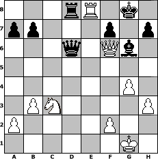 Partie-Notation im PGN-Format [Event "1. Weltmeisterschaft @ myschach.de"] [Site "www.mySchach.de"] [Date "2006.09.15"] [Round "1"] [White "Greenhorn"] [Black "MartinSilies"] [ECO "A56"] [WhitemyELO "1493"] [BlackmyELO "1547"] [Result "1-0"] [TimeControl "10/2592000"] [WhiteDays "114"] [BlackDays "043"] [MySchachNr "28478"] 1. d4 Nf6 2. c4 c5 3. Nc3 cxd4 4. Qxd4 Nc6 5. Qd2 e6 6. e4 Bb4 7. Bd3 Ne5 8. Nge2 Nxd3+ 9. Qxd3 d5 10. O-O O-O 11. cxd5 exd5 12. exd5 Bxc3 13. Nxc3 Bg4 14. h3 Bh5 15. Re1 Bg6 16. Qf3 Qd6 17. Bf4 Qb6 18. b3 Rfe8 19. Be3 Qd6 20. Bf4 Qc5 21. d6 Red8 22. Rac1 Qb6 23. Rcd1 Bh5 24. g4 Bg6 25. Re7 Rd7 26. Be5 Rad8 27. Bxf6 gxf6 28. Qxf6 Rxd6 29. Rxd6 Qxd6 30. Re8+ 1-0 Stellungs-Notation im FEN-Format 3rR1k1/pp3p1p/3q1Qb1/8/6P1/1PN4P/P4P2/6K1 - - - 1 30 Geschlagene Figuren Weiss: ![]() ![]() ![]() ![]() ![]() ![]() ![]() ![]() ![]() ![]() ![]() ![]() ![]() ![]() ![]() Geschlagene Figuren Schwarz: ![]() ![]() ![]() ![]() ![]() ![]() ![]() ![]() ![]() ![]() ![]() ![]() ![]() ![]() ![]() Klicken Sie auf eine geschlagene Figur um den gewünschten Zug darzustellen!