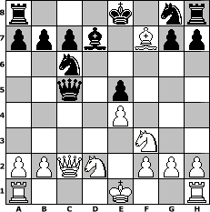 Partie-Notation im PGN-Format [Event "9. Frankenwaldsturnier"] [Site "www.mySchach.de"] [Date "2009.08.21"] [Round "1"] [White "muellerh"] [Black "Schefsche"] [ECO "D20"] [WhitemyELO "1477"] [BlackmyELO "1363"] [Result "1-0"] [TimeControl "10/864000"] [WhiteDays "19"] [BlackDays "15"] [MySchachNr "58477"] 1. d4 d5 2. c4 dxc4 3. e4 e5 4. Bxc4 Qxd4 5. Qa4+ Bd7 6. Qc2 Bb4+ 7. Bd2 Bxd2+ 8. Nxd2 Nc6 9. Ngf3 Qc5 10. Bxf7+ 1-0 Stellungs-Notation im FEN-Format r3k1nr/pppb1Bpp/2n5/2q1p3/4P3/5N2/PPQN1PPP/R3K2R - KQkq - 0 10 Geschlagene Figuren Weiss: ![]() ![]() ![]() ![]() ![]() ![]() ![]() ![]() ![]() ![]() ![]() ![]() ![]() ![]() ![]() Geschlagene Figuren Schwarz: ![]() ![]() ![]() ![]() ![]() ![]() ![]() ![]() ![]() ![]() ![]() ![]() ![]() ![]() ![]() Klicken Sie auf eine geschlagene Figur um den gewünschten Zug darzustellen!