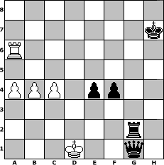 Partie-Notation im PGN-Format [Event "1. Weltmeisterschaft @ myschach.de"] [Site "www.mySchach.de"] [Date "2006.09.15"] [Round "1"] [White "Master1"] [Black "MartinSilies"] [ECO "C42"] [WhitemyELO "2017"] [BlackmyELO "1547"] [Result "0-1"] [TimeControl "10/2592000"] [WhiteDays "129"] [BlackDays "095"] [MySchachNr "28487"] 1. e4 e5 2. Nf3 Nf6 3. Nc3 Bb4 4. Nxe5 Bxc3 5. dxc3 O-O 6. Bg5 d6 7. Bxf6 Qxf6 8. Nd3 Re8 9. f3 Nc6 10. Qe2 Ne5 11. O-O-O Be6 12. Nxe5 dxe5 13. b3 Red8 14. Rxd8+ Rxd8 15. g4 Qf4+ 16. Kb2 h6 17. h3 a6 18. Bg2 Rd2 19. Qe1 Rxg2 20. c4 Qxf3 21. Rf1 Qe2 22. Qxe2 Rxe2 23. Rd1 Rxe4 24. c5 Bxg4 25. hxg4 Rxg4 26. Rd8+ Kh7 27. Rd7 b6 28. c6 h5 29. Rxc7 f5 30. Rb7 Rg6 31. c7 Rc6 32. a4 h4 33. c4 h3 34. Rxb6 Rxc7 35. Re6 e4 36. Rd6 g5 37. Rd2 g4 38. Rh2 Kg6 39. Kc3 f4 40. b4 g3 41. Rxh3 g2 42. Rh8 g1=Q 43. Rg8+ Rg7 44. Ra8 Qe3+ 45. Kc2 Kh7 46. Rxa6 Rg2+ 47. Kd1 Qg1# 0-1 Stellungs-Notation im FEN-Format 8/7k/R7/8/PPP1pp2/8/6r1/3K2q1 - - - 3 48 Geschlagene Figuren Weiss: ![]() ![]() ![]() ![]() ![]() ![]() ![]() ![]() ![]() ![]() ![]() ![]() ![]() ![]() ![]() Geschlagene Figuren Schwarz: ![]() ![]() ![]() ![]() ![]() ![]() ![]() ![]() ![]() ![]() ![]() ![]() ![]() ![]() ![]() Klicken Sie auf eine geschlagene Figur um den gewünschten Zug darzustellen!