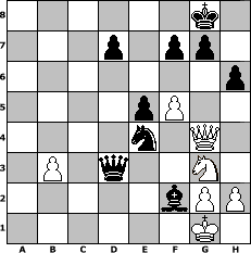 Partie-Notation im PGN-Format [Event "Arthur Conan Doyle"] [Site "www.mySchach.de"] [Date "2009.05.26"] [Round "1"] [White "neve"] [Black "kischok46"] [ECO "B00"] [WhitemyELO "1550"] [BlackmyELO "2023"] [Result "0-1"] [TimeControl "10/1728000"] [WhiteDays "80"] [BlackDays "78"] [MySchachNr "56081"] 1. e4 b6 2. d4 Bb7 3. Bd3 e6 4. Nf3 c5 5. O-O cxd4 6. Nxd4 Nc6 7. Nxc6 Bxc6 8. Nc3 Bd6 9. Re1 Qb8 10. Qh5 Nf6 11. Qh3 h6 12. Rb1 Be5 13. Bd2 O-O 14. Qh4 Qb7 15. f3 Rac8 16. Ne2 b5 17. Ng3 b4 18. c3 Bb5 19. Bxb5 Qxb5 20. f4 Bc7 21. Kh1 Bd8 22. Qh3 bxc3 23. bxc3 Qd3 24. Be3 Rxc3 25. Bxa7 Rc2 26. f5 Ba5 27. Re3 Qa6 28. Bd4 e5 29. Bb2 Rb8 30. Rb3 Rxb3 31. axb3 Rxb2 32. Rxb2 Qd3 33. Rf2 Nxe4 34. Kg1 Bb6 35. Qg4 Bxf2+ 0-1 Stellungs-Notation im FEN-Format 6k1/3p1pp1/7p/4pP2/4n1Q1/1P1q2N1/5bPP/6K1 - - - 0 36 Geschlagene Figuren Weiss: Geschlagene Figuren Schwarz: Klicken Sie auf eine geschlagene Figur um den gewünschten Zug darzustellen!