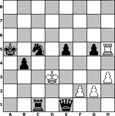 Partie-Notation im PGN-Format [Event "Weihnachtsturnier 2012"] [Site "www.mySchach.de"] [Date "2012.12.18"] [Round "1"] [White "borsti"] [Black "lotchi"] [ECO "C65"] [WhitemyELO "1254"] [BlackmyELO "1273"] [Result "0-1"] [TimeControl "10/864000"] [WhiteDays "10"] [BlackDays "09"] [MySchachNr "85580"] 1. e4 e5 2. Nf3 Nc6 3. Bb5 Nf6 4. d3 Bb4+ 5. Bd2 Bxd2+ 6. Qxd2 d6 7. Qg5 g6 8. Nc3 Bd7 9. Bxc6 Bxc6 10. h3 h6 11. Qd2 Qd7 12. O-O O-O-O 13. a4 g5 14. a5 a6 15. b4 Bb5 16. Rfe1 Qe6 17. Nxb5 axb5 18. a6 bxa6 19. Rxa6 Kb7 20. Ra5 c6 21. Rea1 Ra8 22. Qc3 Rxa5 23. bxa5 Ra8 24. Qb4 Ne8 25. c4 Nc7 26. Ne1 c5 27. cxb5 cxb4 28. b6 Na6 29. Nc2 Qb3 30. Ne3 Qxd3 31. Rd1 Qxe4 32. Rxd6 Qb1+ 33. Kh2 Qa1 34. Nc4 Qa2 35. Rd7+ Kc6 36. Rxf7 Qxc4 37. Rf6+ Kb5 38. b7 Rb8 39. Rb6+ Kxa5 40. Rxh6 Rxb7 41. Rh5 Qf4+ 42. Kg1 Rc7 43. Kf1 Rc1+ 44. Ke2 Qe4+ 45. Kd2 Qe1+ 46. Kd3 Nc5# 0-1 Stellungs-Notation im FEN-Format 8/8/8/k1n1p1pR/1p6/3K3P/5PP1/2r1q3 - - - 12 47 Geschlagene Figuren Weiss: Geschlagene Figuren Schwarz: Klicken Sie auf eine geschlagene Figur um den gewünschten Zug darzustellen!