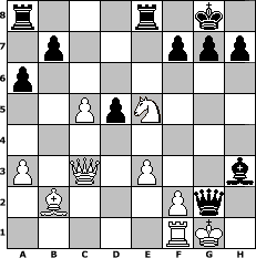 Partie-Notation im PGN-Format [Event "Vogelwild"] [Site "www.mySchach.de"] [Date "2009.06.13"] [Round "1"] [White "rikilatic"] [Black "Vahl1"] [ECO "D01"] [WhitemyELO "1451"] [BlackmyELO "1720"] [Result "0-1"] [TimeControl "10/864000"] [WhiteDays "28"] [BlackDays "22"] [MySchachNr "56564"] 1. d4 d5 2. Nc3 Nc6 3. e3 Nf6 4. h3 a6 5. Qf3 Nb4 6. Bd3 c5 7. dxc5 e5 8. Na4 e4 9. Bxe4 Nxe4 10. Qe2 Nxc5 11. Nxc5 Bxc5 12. a3 Nc6 13. Nf3 Qf6 14. c3 O-O 15. b4 Qxc3+ 16. Qd2 Qxa1 17. bxc5 Qf6 18. Bb2 Qg6 19. Nh4 Qe4 20. Nf3 Re8 21. O-O Bxh3 22. Qc3 Ne5 23. Nxe5 Qxg2# 0-1 Stellungs-Notation im FEN-Format r3r1k1/1p3ppp/p7/2PpN3/8/P1Q1P2b/1B3Pq1/5RK1 - - - 0 24 Geschlagene Figuren Weiss: Geschlagene Figuren Schwarz: Klicken Sie auf eine geschlagene Figur um den gewünschten Zug darzustellen!