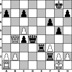 Partie-Notation im PGN-Format [Event "Der Beste hinter den 1900ern(4/10) oder 10 hoch 2"] [Site "www.mySchach.de"] [Date "2010.05.22"] [Round "1"] [White "ujack1961"] [Black "Juliette2103"] [ECO "C57"] [WhitemyELO "1640"] [BlackmyELO "1552"] [Result "0-1"] [TimeControl "10/864000"] [WhiteDays "07"] [BlackDays "10"] [MySchachNr "65698"] 1. e4 e5 2. Nf3 Nc6 3. Bc4 Nf6 4. Ng5 d5 5. exd5 Nd4 6. O-O b5 7. c3 bxc4 8. cxd4 Nxd5 9. Re1 Be7 10. Rxe5 f6 11. Qf3 Qd6 12. Rxd5 Qa6 13. Ne4 O-O 14. Nbc3 Bb7 15. Nc5 Bxc5 16. dxc5 Rae8 17. Qd1 Qe6 18. f3 Bxd5 19. Nxd5 Qxd5 20. d4 Re6 21. Bf4 Rfe8 22. Qd2 Re2 23. Qc3 g5 24. Bg3 R8e3 25. Qb4 Qxd4 26. Bf2 Rxf2 0-1 Stellungs-Notation im FEN-Format 6k1/p1p4p/5p2/2P3p1/1Qpq4/4rP2/PP3rPP/R5K1 - - - 0 27 Geschlagene Figuren Weiss: Geschlagene Figuren Schwarz: Klicken Sie auf eine geschlagene Figur um den gewünschten Zug darzustellen!