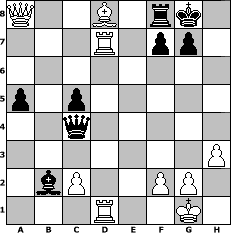 Partie-Notation im PGN-Format [Event "EU Weihnachts-Gipfel Spiele"] [Site "www.mySchach.de"] [Date "2011.12.25"] [Round "1"] [White "Vahl1"] [Black "Steffi"] [ECO "A13"] [WhitemyELO "1586"] [BlackmyELO "1548"] [Result "1-0"] [TimeControl "10/1728000"] [WhiteDays "34"] [BlackDays "33"] [MySchachNr "78574"] 1. c4 e6 2. e4 d5 3. exd5 exd5 4. cxd5 Qxd5 5. Nc3 Qd8 6. a3 Nf6 7. h3 Nc6 8. Nf3 Be7 9. Bb5 Bd7 10. O-O O-O 11. d4 a6 12. Bc4 h6 13. Re1 b5 14. Bb3 b4 15. Nd5 bxa3 16. Nxf6+ Bxf6 17. Rxa3 Bf5 18. Bc4 Nxd4 19. Bd3 Nxf3+ 20. Qxf3 Bxd3 21. Rxd3 Qc8 22. Bxh6 Bxb2 23. Bg5 c5 24. Red1 Qe6 25. Rd7 Qc4 26. Bd8 a5 27. Qxa8 1-0 Stellungs-Notation im FEN-Format Q2B1rk1/3R1pp1/8/p1p5/2q5/7P/1bP2PP1/3R2K1 - - - 0 27 Geschlagene Figuren Weiss: Geschlagene Figuren Schwarz: Klicken Sie auf eine geschlagene Figur um den gewünschten Zug darzustellen!