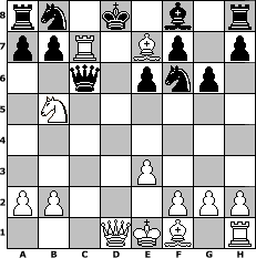 Partie-Notation im PGN-Format [Event "BENONI"] [Site "www.mySchach.de"] [Date "2005.06.20"] [Round "1"] [White "Antaeus"] [Black "Gno"] [ECO "A56"] [WhitemyELO "1674"] [BlackmyELO "1141"] [Result "1-0"] [TimeControl "10/864000"] [WhiteDays "10"] [BlackDays "10"] [MySchachNr "14197"] 1. d4 Nf6 2. c4 c5 3. dxc5 Qa5+ 4. Nc3 Qxc5 5. e3 e6 6. Nge2 g6 7. Bd2 Qxc4 8. Nd4 Qb4 9. Ncb5 Qc5 10. Rc1 Qb6 11. Rxc8+ Ke7 12. Bb4+ d6 13. Bxd6+ Kd7 14. Rc7+ Kd8 15. Nc6+ Qxc6 16. Be7+ 1-0 Stellungs-Notation im FEN-Format rn1k1b1r/ppR1Bp1p/2q1pnp1/1N6/8/4P3/PP3PPP/3QKB1R - K - 1 16 Geschlagene Figuren Weiss: ![]() ![]() ![]() ![]() ![]() ![]() ![]() ![]() ![]() ![]() ![]() ![]() ![]() ![]() ![]() Geschlagene Figuren Schwarz: ![]() ![]() ![]() ![]() ![]() ![]() ![]() ![]() ![]() ![]() ![]() ![]() ![]() ![]() ![]() Klicken Sie auf eine geschlagene Figur um den gewünschten Zug darzustellen!