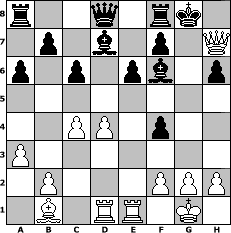 Partie-Notation im PGN-Format [Event "Clubmeisterschaft Aljechins Enkel"] [Site "www.mySchach.de"] [Date "2015.10.17"] [Round "1"] [White "Holzhacker"] [Black "Joschi"] [ECO "B17"] [WhitemyELO "2096"] [BlackmyELO "1604"] [Result "1-0"] [TimeControl "10/2592000"] [WhiteDays "89"] [BlackDays "90"] [MySchachNr "100800"] 1. e4 c6 2. d4 d5 3. Nc3 dxe4 4. Nxe4 Nd7 5. Nf3 Ngf6 6. Ng3 e6 7. Bd3 Be7 8. O-O O-O 9. Qe2 Nb6 10. a3 Nbd5 11. Ne5 Bd7 12. c4 Nb6 13. Bf4 Bc8 14. Rad1 Nbd7 15. Rfe1 a6 16. Bb1 h6 17. Qc2 g5 18. Nh5 gxf4 19. Nxd7 Bxd7 20. Nxf6+ Bxf6 21. Qh7# 1-0 Stellungs-Notation im FEN-Format r2q1rk1/1p1b1p1Q/p1p1pb1p/8/2PP1p2/P7/1P3PPP/1B1RR1K1 - - - 1 21 Geschlagene Figuren Weiss: Geschlagene Figuren Schwarz: Klicken Sie auf eine geschlagene Figur um den gewünschten Zug darzustellen!
