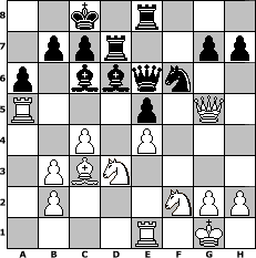 Partie-Notation im PGN-Format [Event "Wanderpokal 2007"] [Site "www.mySchach.de"] [Date "2007.06.23"] [Round "1"] [White "Baehr008"] [Black "GIM1961"] [Variant "Fischerrandom"] [SetUp "1"] [FEN "rkbnnbqr/pppppppp/8/8/8/8/PPPPPPPP/RKBNNBQR w KQkq - 0 1"] [WhitemyELO "2142"] [BlackmyELO "2024"] [Result "1-0"] [TimeControl "10/864000"] [WhiteDays "15"] [BlackDays "09"] [MySchachNr "35937"] 1. d4 d5 2. f3 f6 3. e4 dxe4 4. fxe4 e5 5. dxe5 fxe5 6. Qe3 Qe6 7. Nf2 Nc6 8. Bb5 Nd4 9. Ba4 Nf6 10. Ned3 Qc4 11. Bb3 Nxb3 12. axb3 Qe6 13. Bd2 Bd6 14. Bc3 a6 15. O-O Bd7 16. Qg5 Bb5 17. Rfe1 Re8 18. Ba5 O-O-O 19. c4 Bc6 20. Bc3 Rd7 21. Ra5 1-0 Stellungs-Notation im FEN-Format 2k1r3/1ppr2pp/p1bbqn2/R3p1Q1/2P1P3/1PBN4/1P3NPP/4R1K1 - - - 4 21 Geschlagene Figuren Weiss: Geschlagene Figuren Schwarz: Klicken Sie auf eine geschlagene Figur um den gewünschten Zug darzustellen!