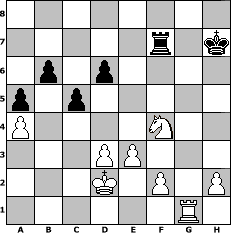 Partie-Notation im PGN-Format [Event "CN OPEN 2011"] [Site "www.mySchach.de"] [Date "2011.11.29"] [Round "1"] [White "nogumo"] [Black "Knight"] [ECO "A00"] [WhitemyELO "1691"] [BlackmyELO "1257"] [Result "1-0"] [TimeControl "10/2592000"] [WhiteDays "28"] [BlackDays "30"] [MySchachNr "77843"] 1. b4 e5 2. Bb2 Bxb4 3. Bxe5 Nf6 4. Nc3 d6 5. Bxf6 Qxf6 6. Nd5 Bxd2+ 7. Kxd2 Qd8 8. e3 O-O 9. Bd3 Nc6 10. Nh3 Bxh3 11. Qh5 g6 12. Qxh3 h5 13. Rab1 b6 14. g4 Ne5 15. gxh5 c6 16. hxg6 fxg6 17. Nf4 Rf6 18. Rhf1 Nxd3 19. cxd3 c5 20. Rg1 Qe7 21. Rxg6+ Rxg6 22. Nxg6 Qg7 23. Qe6+ Kh7 24. Qe7 Rg8 25. Qxg7+ Rxg7 26. Nf4 Rf7 27. Rg1 a5 28. a4 1-0 Stellungs-Notation im FEN-Format 8/5r1k/1p1p4/p1p5/P4N2/3PP3/3K1P1P/6R1 - - - 0 28 Geschlagene Figuren Weiss: Geschlagene Figuren Schwarz: Klicken Sie auf eine geschlagene Figur um den gewünschten Zug darzustellen!