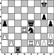 Partie-Notation im PGN-Format [Event "Enkel-Meisterschaft 2017"] [Site "www.mySchach.de"] [Date "2017.09.30"] [Round "1"] [White "Joschi"] [Black "lisama"] [ECO "B70"] [WhitemyELO "1584"] [BlackmyELO "1545"] [Result "0-1"] [TimeControl "10/2592000"] [WhiteDays "120"] [BlackDays "113"] [MySchachNr "109802"] 1. e4 c5 2. Nf3 d6 3. d4 cxd4 4. Nxd4 Nf6 5. Nc3 g6 6. Be2 Bg7 7. O-O O-O 8. Nf3 Nbd7 9. h3 Nc5 10. Bd3 b6 11. Re1 Bb7 12. Bf4 Rc8 13. Qd2 b5 14. Nxb5 Ncxe4 15. Bxe4 Nxe4 16. Qe2 e5 17. Be3 a6 18. Na3 f5 19. c3 h5 20. Rad1 d5 21. Nc2 f4 22. Bc1 Re8 23. Nb4 Qa5 24. a3 Red8 25. Rd3 d4 26. cxd4 exd4 27. Bxf4 Qf5 28. Bc1 a5 29. Nc2 Ba6 30. Nfxd4 Bxd4 31. Nxd4 Rxd4 32. Rxd4 Bxe2 33. Rxe2 Rxc1+ 34. Kh2 Qe5+ 0-1 Stellungs-Notation im FEN-Format 6k1/8/6p1/p3q2p/3Rn3/P6P/1P2RPPK/2r5 - - - 2 35 Geschlagene Figuren Weiss: Geschlagene Figuren Schwarz: Klicken Sie auf eine geschlagene Figur um den gewünschten Zug darzustellen!