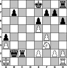 Partie-Notation im PGN-Format [Event "unter uns Nr. 19 (Osterturnier)"] [Site "www.mySchach.de"] [Date "2014.04.17"] [Round "2"] [White "borsti"] [Black "reisinger"] [ECO "C02"] [WhitemyELO "1227"] [BlackmyELO "1468"] [Result "0-1"] [TimeControl "10/864000"] [WhiteDays "30"] [BlackDays "30"] [MySchachNr "93983"] 1. e4 e6 2. d4 d5 3. e5 c5 4. Nf3 cxd4 5. Nxd4 Bc5 6. Nb3 Bb6 7. Qd3 h6 8. Bf4 Nc6 9. c3 Nge7 10. Bg3 Nf5 11. N1d2 Qc7 12. f4 Bd7 13. O-O-O Nb4 14. Qf3 a5 15. a3 Na6 16. Bf2 a4 17. Na1 d4 18. Bxa6 Rxa6 19. Nc2 dxc3 20. Bxb6 cxb2+ 21. Kb1 Rxb6 22. Nb4 Bc6 23. Nxc6 Rxc6 24. Kxb2 Rc2+ 25. Ka1 Nd4 26. Rb1 Nxf3 27. Nxf3 Qc3+ 28. Rb2 Qxb2# 0-1 Stellungs-Notation im FEN-Format 4k2r/1p3pp1/4p2p/4P3/p4P2/P4N2/1qr1P1PP/K6R - k - 0 29 Geschlagene Figuren Weiss: Geschlagene Figuren Schwarz: Klicken Sie auf eine geschlagene Figur um den gewünschten Zug darzustellen!