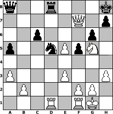 Partie-Notation im PGN-Format [Event "Schlusslichterturnier Nr.2"] [Site "www.mySchach.de"] [Date "2010.10.25"] [Round "1"] [White "Seneca"] [Black "Knight"] [ECO "E00"] [WhitemyELO "1483"] [BlackmyELO "1185"] [Result "1-0"] [TimeControl "10/2592000"] [WhiteDays "30"] [BlackDays "30"] [MySchachNr "69320"] 1. d4 Nf6 2. c4 e6 3. e3 Bb4+ 4. Bd2 Bxd2+ 5. Nxd2 d5 6. Ngf3 Nc6 7. Bd3 O-O 8. O-O a5 9. a3 dxc4 10. Nxc4 b5 11. Nce5 Nxe5 12. dxe5 Nd5 13. Bxb5 Ba6 14. Bxa6 Rxa6 15. h3 f5 16. Qd3 g6 17. Qxa6 Qa8 18. Qxe6+ Kh8 19. Rad1 Rd8 20. Qf7 c6 21. Ng5 1-0 Stellungs-Notation im FEN-Format q2r3k/5Q1p/2p3p1/p2nPpN1/8/P3P2P/1P3PP1/3R1RK1 - - - 1 21 Geschlagene Figuren Weiss: Geschlagene Figuren Schwarz: Klicken Sie auf eine geschlagene Figur um den gewünschten Zug darzustellen!