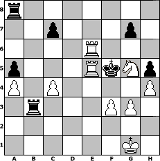 Partie-Notation im PGN-Format [Event "9. Frankenwaldsturnier"] [Site "www.mySchach.de"] [Date "2009.08.21"] [Round "2"] [White "ujack1961"] [Black "Schefsche"] [ECO "C57"] [WhitemyELO "1706"] [BlackmyELO "1363"] [Result "1-0"] [TimeControl "10/864000"] [WhiteDays "40"] [BlackDays "30"] [MySchachNr "58481"] 1. e4 e5 2. Nf3 Nc6 3. Bc4 Nf6 4. Ng5 d5 5. exd5 Nxd5 6. Nxf7 Kxf7 7. Qf3+ Ke8 8. Bxd5 Qd6 9. Bxc6+ Qxc6 10. Qxc6+ bxc6 11. O-O Bf5 12. d3 Bd6 13. Nc3 h5 14. h4 Kd7 15. Ne4 Be7 16. Bg5 Bxg5 17. Nxg5 Ke7 18. Rfe1 Kf6 19. f3 Rab8 20. b3 Rb4 21. g3 Rd4 22. a4 a5 23. Re2 c5 24. Rae1 Rd5 25. c4 Rxd3 26. Rxe5 Rxb3 27. Rxc5 Ra8 28. Rc6+ Be6 29. Rcxe6+ Kf5 30. R1e5# 1-0 Stellungs-Notation im FEN-Format r7/2p3p1/4R3/p3RkNp/P1P4P/1r3PP1/8/6K1 - - - 2 30 Geschlagene Figuren Weiss: ![]() ![]() ![]() ![]() ![]() ![]() ![]() ![]() ![]() ![]() ![]() ![]() ![]() ![]() ![]() Geschlagene Figuren Schwarz: ![]() ![]() ![]() ![]() ![]() ![]() ![]() ![]() ![]() ![]() ![]() ![]() ![]() ![]() ![]() Klicken Sie auf eine geschlagene Figur um den gewünschten Zug darzustellen!