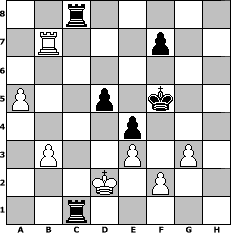 Partie-Notation im PGN-Format [Event "Mannschaftskampf - Ritter gegen Oldies"] [Site "www.mySchach.de"] [Date "2007.06.01"] [Round "1"] [Board "2"] [White "Dali"] [Black "BirdofPray1"] [ECO "E20"] [WhitemyELO "1652"] [BlackmyELO "2215"] [Result "0-1"] [TimeControl "10/2592000"] [WhiteDays "115"] [BlackDays "030"] [MySchachNr "35342"] 1. d4 Nf6 2. c4 e6 3. Nc3 Bb4 4. Bd2 c5 5. Nf3 cxd4 6. Nb5 Bxd2+ 7. Qxd2 Nc6 8. Nd6+ Ke7 9. c5 Qa5 10. Qxa5 Nxa5 11. Nxd4 b6 12. Nxc8+ Rhxc8 13. cxb6 axb6 14. h4 Nc4 15. b3 Na3 16. g3 d5 17. Rd1 Nc2+ 18. Nxc2 Rxc2 19. a4 Rb2 20. e3 Ne4 21. Rh2 h5 22. Be2 Nc3 23. Bxh5 Nxd1 24. Bxd1 Rc8 25. h5 Rc1 26. Rh4 e5 27. h6 gxh6 28. Rxh6 Rbb1 29. Ke2 e4 30. Rxb6 Rxd1 31. a5 Rdc1 32. Rb7+ Ke6 33. Rb6+ Kf5 34. Kd2 Rc8 35. Rb7 Rbc1 0-1 Stellungs-Notation im FEN-Format 2r5/1R3p2/8/P2p1k2/4p3/1P2P1P1/3K1P2/2r5 - - - 9 36 Geschlagene Figuren Weiss: Geschlagene Figuren Schwarz: Klicken Sie auf eine geschlagene Figur um den gewünschten Zug darzustellen!