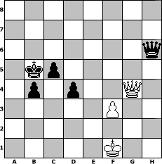 | Partie-Notation im PGN-Format [Event "Godzilla Open - Gruppe A "] [Site "www.mySchach.de"] [Date "2014.04.01"] [Round "1"] [White "Mattheus"] [Black "lotchi"] [ECO "C20"] [WhitemyELO "1174"] [BlackmyELO "1345"] [Result "0-1"] [TimeControl "10/864000"] [WhiteDays "10"] [BlackDays "10"] [MySchachNr "93758"] 1. e4 e5 2. Qh5 d6 3. Bc4 g6 4. Qf3 Nf6 5. Nc3 a6 6. d3 Bg4 7. Qg3 b5 8. Bb3 h6 9. Be3 h5 10. Nge2 Bxe2 11. Nxe2 Nc6 12. O-O-O a5 13. a4 b4 14. Bg5 Be7 15. h4 Nd4 16. Nxd4 exd4 17. e5 Nh7 18. Bxe7 Qxe7 19. Rde1 O-O-O 20. exd6 Qxd6 21. Qh3+ f5 22. f3 Qf4+ 23. Kb1 Rde8 24. Rxe8+ Rxe8 25. Bd5 Nf6 26. Bc4 Rf8 27. Be6+ Kb8 28. Bc4 c5 29. Re1 Re8 30. Rxe8+ Nxe8 31. Bb5 Nc7 32. Qh1 Nxb5 33. axb5 Qe5 34. Qf1 f4 35. g4 Kb7 36. gxh5 gxh5 37. b3 Kb6 38. Qh3 Qe1+ 39. Ka2 Qe8 40. Qf5 Kxb5 41. Qxh5 Qa8 42. Qf5 Qd8 43. Qxf4 Qc8 44. h5 a4 45. h6 axb3+ 46. cxb3 Qa8+ 47. Kb1 Qg8 48. Qg4 Qxb3+ 49. Kc1 Qc3+ 50. Kb1 Qe1+ 51. Kc2 Qc3+ 52. Kd1 Qxd3+ 53. Ke1 Qe3+ 54. Kf1 Qxh6 0-1 Stellungs-Notation im FEN-Format 8/8/7q/1kp5/1p1p2Q1/5P2/8/5K2 - - - 0 55 Geschlagene Figuren Weiss:                              Geschlagene Figuren Schwarz:                               Klicken Sie auf eine geschlagene Figur um den gewünschten Zug darzustellen!