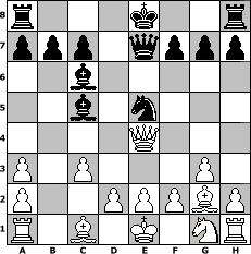 Partie-Notation im PGN-Format [Event "Wrixum - Open die XI"] [Site "www.mySchach.de"] [Date "2013.08.09"] [Round "1"] [White "Papale"] [Black "mattse"] [ECO "A00"] [WhitemyELO "1672"] [BlackmyELO "1645"] [Result "0-1"] [TimeControl "10/2592000"] [WhiteDays "23"] [BlackDays "30"] [MySchachNr "89640"] 1. a3 e5 2. c4 Nf6 3. Nc3 d5 4. cxd5 Nxd5 5. Nf3 Nc6 6. Qb3 Nxc3 7. bxc3 e4 8. Ng1 Bc5 9. Qc4 Qe7 10. g3 Bd7 11. Bg2 Ne5 12. Qxe4 Bc6 0-1 Stellungs-Notation im FEN-Format r3k2r/ppp1qppp/2b5/2b1n3/4Q3/P1P3P1/P2PPPBP/R1B1K1NR - KQkq - 1 13 Geschlagene Figuren Weiss: ![]() ![]() ![]() ![]() ![]() ![]() ![]() ![]() ![]() ![]() ![]() ![]() ![]() ![]() ![]() Geschlagene Figuren Schwarz: ![]() ![]() ![]() ![]() ![]() ![]() ![]() ![]() ![]() ![]() ![]() ![]() ![]() ![]() ![]() Klicken Sie auf eine geschlagene Figur um den gewünschten Zug darzustellen!