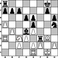 Partie-Notation im PGN-Format [Event "Sommer 2017"] [Site "www.mySchach.de"] [Date "2017.06.24"] [Round "1"] [White "Knight"] [Black "Andylein1989"] [ECO "C50"] [WhitemyELO "1269"] [BlackmyELO "1636"] [Result "0-1"] [TimeControl "10/1728000"] [WhiteDays "38"] [BlackDays "40"] [MySchachNr "108702"] 1. e4 e5 2. Nf3 Nc6 3. Bc4 Bc5 4. d3 Nf6 5. Bg5 h6 6. Bh4 O-O 7. O-O d6 8. Nc3 Be6 9. Bxe6 fxe6 10. a3 Qe8 11. b4 Bb6 12. Re1 Qh5 13. Bg3 Nd4 14. a4 Nxf3+ 15. Qxf3 Qxf3 16. gxf3 Nh5 17. a5 Bd4 18. Ra3 Rxf3 0-1 Stellungs-Notation im FEN-Format r5k1/ppp3p1/3pp2p/P3p2n/1P1bP3/R1NP1rB1/2P1PP1P/4R1K1 - - - 0 19 Geschlagene Figuren Weiss: Geschlagene Figuren Schwarz: Klicken Sie auf eine geschlagene Figur um den gewünschten Zug darzustellen!