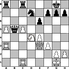 Partie-Notation im PGN-Format [Event "Sommer 2010 Teil 2"] [Site "www.mySchach.de"] [Date "2010.06.24"] [Round "1"] [White "muetoe"] [Black "Chaos"] [ECO "A15"] [WhitemyELO "1871"] [BlackmyELO "1701"] [Result "1-0"] [TimeControl "10/1728000"] [WhiteDays "69"] [BlackDays "74"] [MySchachNr "66496"] 1. c4 Nf6 2. d4 b5 3. cxb5 a6 4. e3 e6 5. Nf3 Be7 6. Nc3 O-O 7. Bd2 Bb7 8. a4 axb5 9. Bxb5 Nc6 10. O-O Nb4 11. Ne5 d6 12. Nd3 Na6 13. Qc2 c6 14. Bxa6 Bxa6 15. b4 Qb6 16. f3 Rfb8 17. Rfb1 Rc8 18. a5 Qb7 19. e4 Qa7 20. Be3 Nd7 21. Ra3 Bf6 22. Ne2 Bb5 23. Ndf4 Qa6 24. Rc1 Bg5 25. Qd2 c5 26. bxc5 Bxe2 27. Nxe2 Bxe3+ 28. Qxe3 dxc5 29. dxc5 Qb5 30. Nd4 1-0 Stellungs-Notation im FEN-Format r1r3k1/3n1ppp/4p3/PqP5/3NP3/R3QP2/6PP/2R3K1 - - - 2 30 Geschlagene Figuren Weiss: Geschlagene Figuren Schwarz: Klicken Sie auf eine geschlagene Figur um den gewünschten Zug darzustellen!