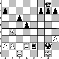 Partie-Notation im PGN-Format [Event "Bobby Fischer Ged"] [Site "www.mySchach.de"] [Date "2008.02.01"] [Round "1"] [White "Andreas"] [Black "deepsabel"] [ECO "C45"] [WhitemyELO "1510"] [BlackmyELO "1779"] [Result "0-1"] [TimeControl "10/864000"] [WhiteDays "22"] [BlackDays "29"] [MySchachNr "42200"] 1. e4 e5 2. Nf3 Nc6 3. d4 exd4 4. Nxd4 Nf6 5. Nxc6 bxc6 6. Nd2 Bc5 7. Be2 d6 8. O-O O-O 9. Bf3 Re8 10. Qe2 d5 11. Nb3 Nxe4 12. Qd3 Nxf2 13. Nxc5 Nxd3 14. Nxd3 Ba6 15. Bf4 Bxd3 16. cxd3 Qd7 17. h3 Qf5 18. Bxc7 Qxd3 19. Rfd1 Qg6 20. Rac1 Re7 21. Ba5 Rae8 22. Bb4 Re2 23. Bxe2 Rxe2 24. Rd2 Qxg2# 0-1 Stellungs-Notation im FEN-Format 6k1/p4ppp/2p5/3p4/1B6/7P/PP1Rr1q1/2R3K1 - - - 0 25 Geschlagene Figuren Weiss: Geschlagene Figuren Schwarz: Klicken Sie auf eine geschlagene Figur um den gewünschten Zug darzustellen!