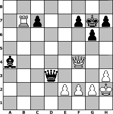 Partie-Notation im PGN-Format [Event "4.Clubmeisterschaft Aljechins Enkel 2010"] [Site "www.mySchach.de"] [Date "2010.12.07"] [Round "1"] [White "Zargoz"] [Black "Schefsche"] [ECO "C60"] [WhitemyELO "1384"] [BlackmyELO "1393"] [Result "0-1"] [TimeControl "10/3456000"] [WhiteDays "00"] [BlackDays "68"] [MySchachNr "70426"] 1. e4 e5 2. Nf3 Nc6 3. Bb5 Qf6 4. Bxc6 Qxc6 5. d3 Bb4+ 6. Bd2 Bxd2+ 7. Nbxd2 Nf6 8. Nxe5 Qb5 9. Ndc4 O-O 10. h3 d5 11. exd5 Qxd5 12. a4 Re8 13. O-O Rxe5 14. Nxe5 Qxe5 15. b3 Qg5 16. Qf3 Nh5 17. Rae1 g6 18. Re8+ Kg7 19. Re1 Nf4 20. R1e4 Ne6 21. R4xe6 Bxe6 22. Rxa8 Qc1+ 23. Kh2 Qxc2 24. Rxa7 Bxb3 25. Rxb7 Bxa4 26. Qf4 Qxd3 0-1 Stellungs-Notation im FEN-Format 8/1Rp2pkp/6p1/8/b4Q2/3q3P/4PPPK/8 - - - 0 27 Geschlagene Figuren Weiss: Geschlagene Figuren Schwarz: Klicken Sie auf eine geschlagene Figur um den gewünschten Zug darzustellen!