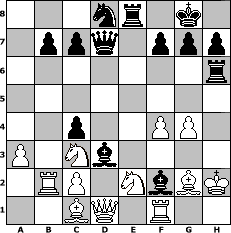 Partie-Notation im PGN-Format [Event "9erD"] [Site "www.mySchach.de"] [Date "2010.11.09"] [Round "1"] [White "Duschgel"] [Black "nyffhans"] [ECO "A25"] [WhitemyELO "1533"] [BlackmyELO "1830"] [Result "0-1"] [TimeControl "10/3456000"] [WhiteDays "40"] [BlackDays "40"] [MySchachNr "69687"] 1. c4 e5 2. Nc3 Nc6 3. g3 Nf6 4. Bg2 Bc5 5. e3 O-O 6. Nge2 Re8 7. O-O d6 8. a3 Bg4 9. b4 Bb6 10. h3 Bf5 11. d3 a6 12. Rb1 Qd7 13. Kh2 Bg6 14. Na4 Ba7 15. b5 axb5 16. Rxb5 Nd8 17. f4 exf4 18. exf4 d5 19. g4 dxc4 20. Rb2 Bxd3 21. Re1 Bf2 22. Nac3 Ra6 23. Rf1 Nxg4+ 24. hxg4 Rh6+ 0-1 Stellungs-Notation im FEN-Format 3nr1k1/1ppq1ppp/7r/8/2p2PP1/P1Nb4/1RP1NbBK/2BQ1R2 - - - 1 25 Geschlagene Figuren Weiss: Geschlagene Figuren Schwarz: Klicken Sie auf eine geschlagene Figur um den gewünschten Zug darzustellen!
