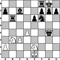 | Partie-Notation im PGN-Format [Event "READY TO RUMBLE!!!"] [Site "www.mySchach.de"] [Date "2004.01.27"] [Round "1"] [White "Blacky"] [Black "kalle"] [ECO "C00"] [WhitemyELO "1493"] [BlackmyELO "1502"] [Result "0-1"] [TimeControl "10/3456000"] [WhiteDays "115"] [BlackDays "120"] [MySchachNr "2028"] 1. e4 e6 2. g4 d5 3. c3 dxe4 4. Qa4+ Bd7 5. Qxe4 Bc6 6. Bb5 Bxb5 7. Qxb7 Bc6 8. Qb3 Bxh1 9. f3 Bd6 10. Qb7 Nd7 11. d4 Bxh2 12. Ne2 Ngf6 13. Bg5 O-O 14. Nd2 Qb8 15. Qc6 Qxb2 16. Nb3 Rab8 17. Rd1 Rb6 18. Qc4 Bxf3 19. Rd2 Qb1+ 20. Nec1 Qe4+ 21. Re2 Bxe2 22. Nxe2 Qxg4 23. Bxf6 Nxf6 24. Qxc7 Bxc7 0-1 Stellungs-Notation im FEN-Format 5rk1/p1b2ppp/1r2pn2/8/3P2q1/1NP5/P3N3/4K3 - - - 0 25 Geschlagene Figuren Weiss:                              Geschlagene Figuren Schwarz:                               Klicken Sie auf eine geschlagene Figur um den gewünschten Zug darzustellen!