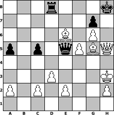 Partie-Notation im PGN-Format [Event "Jugend tunier"] [Site "www.mySchach.de"] [Date "2005.09.09"] [Round "1"] [White "PublicEnemy"] [Black "Milli"] [ECO "B30"] [WhitemyELO "1523"] [BlackmyELO "1444"] [Result "1-0"] [TimeControl "10/2592000"] [WhiteDays "114"] [BlackDays "110"] [MySchachNr "17158"] 1. e4 c5 2. Nf3 Nc6 3. Nc3 d6 4. Bc4 Bd7 5. Ng5 e6 6. O-O Be7 7. Nf3 Nf6 8. Re1 d5 9. exd5 exd5 10. Bxd5 O-O 11. Ne5 Nxe5 12. Rxe5 Ng4 13. Re4 Qc7 14. Rxg4 Bxg4 15. Qxg4 Qe5 16. g3 h5 17. Qd7 Rad8 18. Qxb7 a5 19. d3 Qe1+ 20. Kg2 h4 21. Ne4 h3+ 22. Kxh3 Bd6 23. Nxd6 Rxd6 24. Bxf7+ Kh7 25. Bf4 Rh6+ 26. Bxh6 Qxa1 27. Qe4+ Kh8 28. Qg6 Qxb2 29. f4 Qd4 30. g4 Rd8 31. f5 Rd6 32. Be6 Qf6 33. Qe8+ Kh7 34. g5 Rd8 35. Qh5 Qe5 36. g6+ Kh8 37. Bg5# 1-0 Stellungs-Notation im FEN-Format 3r3k/6p1/4B1P1/p1p1qPBQ/8/3P3K/P1P1P2P/8 - - - 2 37 Geschlagene Figuren Weiss: Geschlagene Figuren Schwarz: Klicken Sie auf eine geschlagene Figur um den gewünschten Zug darzustellen!