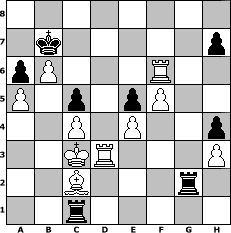 Partie-Notation im PGN-Format [Event "Winterspiele"] [Site "www.mySchach.de"] [Date "2008.12.29"] [Round "1"] [White "ujack1961"] [Black "reisender"] [ECO "C40"] [WhitemyELO "1688"] [BlackmyELO "1446"] [Result "1/2-1/2"] [TimeControl "10/864000"] [WhiteDays "50"] [BlackDays "50"] [MySchachNr "51111"] 1. e4 e5 2. Nf3 f6 3. Nh4 Nh6 4. d4 d6 5. Bxh6 gxh6 6. Qh5+ Ke7 7. Bc4 Qe8 8. Nf5+ Bxf5 9. Qxf5 Nd7 10. dxe5 fxe5 11. Nc3 c6 12. Qe6+ Kd8 13. Qxe8+ Kxe8 14. O-O Kd8 15. Rad1 Kc7 16. f4 Bg7 17. f5 Raf8 18. Be6 Nc5 19. Bc4 b5 20. Bd3 h5 21. b4 Nd7 22. Bxb5 Nb6 23. Be2 h4 24. b5 c5 25. Nd5+ Nxd5 26. Rxd5 Bf6 27. h3 Ra8 28. a4 Rhb8 29. Rfd1 Rd8 30. c4 a6 31. b6+ Kc6 32. a5 Rd7 33. R1d3 Rad8 34. Bd1 Kb7 35. Ba4 Rg7 36. Rxd6 Rdg8 37. Rxf6 Rxg2+ 38. Kf1 Rg1+ 39. Ke2 R8g2+ 40. Ke3 Rg3+ 41. Kd2 R3g2+ 42. Kc3 Rc1+ 43. Bc2 1/2-1/2 Stellungs-Notation im FEN-Format 8/1k5p/pP3R2/P1p1pP2/2P1P2p/2KR3P/2B3r1/2r5 - - - 11 43 Geschlagene Figuren Weiss: ![]() ![]() ![]() ![]() ![]() ![]() ![]() ![]() ![]() ![]() ![]() ![]() ![]() ![]() ![]() Geschlagene Figuren Schwarz: ![]() ![]() ![]() ![]() ![]() ![]() ![]() ![]() ![]() ![]() ![]() ![]() ![]() ![]() ![]() Klicken Sie auf eine geschlagene Figur um den gewünschten Zug darzustellen!