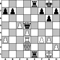 Partie-Notation im PGN-Format [Event "Verschachert #7"] [Site "www.mySchach.de"] [Date "2014.10.08"] [Round "2"] [White "Caligula"] [Black "beowulf"] [ECO "B30"] [WhitemyELO "1357"] [BlackmyELO "1392"] [Result "0-1"] [TimeControl "10/1728000"] [WhiteDays "70"] [BlackDays "67"] [MySchachNr "96239"] 1. e4 c5 2. Nf3 Nc6 3. Nc3 g6 4. d3 Bg7 5. Bd2 e6 6. a3 d5 7. exd5 exd5 8. b4 Qe7+ 9. Be2 Nf6 10. O-O O-O 11. Bg5 Bg4 12. Nxd5 Qd6 13. Bxf6 Bxf6 14. Ne3 Bxa1 15. Qxa1 Be6 16. bxc5 Qxc5 17. d4 Qd6 18. c4 Ne7 19. c5 Qd7 20. Rd1 Nd5 21. Rd2 Rfe8 22. Nxd5 Bxd5 23. Ne5 Qf5 24. Nd3 Qg5 25. Nf4 Qxf4 26. Qd1 Qg5 27. g3 Re4 28. Bf3 Re6 29. Bxd5 Qxd5 30. Rd3 Rd8 31. f3 Rde8 32. Qd2 Re1+ 0-1 Stellungs-Notation im FEN-Format 4r1k1/pp3p1p/6p1/2Pq4/3P4/P2R1PP1/3Q3P/4r1K1 - - - 3 33 Geschlagene Figuren Weiss: ![]() ![]() ![]() ![]() ![]() ![]() ![]() ![]() ![]() ![]() ![]() ![]() ![]() ![]() ![]() Geschlagene Figuren Schwarz: ![]() ![]() ![]() ![]() ![]() ![]() ![]() ![]() ![]() ![]() ![]() ![]() ![]() ![]() ![]() Klicken Sie auf eine geschlagene Figur um den gewünschten Zug darzustellen!