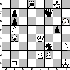 Partie-Notation im PGN-Format [Event "Herbst 2014"] [Site "www.mySchach.de"] [Date "2014.09.08"] [Round "1"] [White "Winston"] [Black "miu"] [ECO "C20"] [WhitemyELO "1440"] [BlackmyELO "1633"] [Result "1-0"] [TimeControl "10/2592000"] [WhiteDays "119"] [BlackDays "118"] [MySchachNr "95832"] 1. e4 e5 2. a3 Nf6 3. Nc3 Nc6 4. Bc4 Bc5 5. d3 h6 6. Nf3 d6 7. h3 O-O 8. Bd2 a6 9. O-O Be6 10. Bd5 Bxd5 11. exd5 Ne7 12. b4 Ba7 13. a4 Nfxd5 14. Nxd5 Nxd5 15. c4 Ne7 16. b5 axb5 17. axb5 Bb6 18. Rxa8 Qxa8 19. Bc3 f5 20. Qd2 Ng6 21. Bb4 Nf4 22. Kh2 g5 23. d4 e4 24. g3 Ne6 25. c5 dxc5 26. dxc5 Rd8 27. Qc3 Qa2 28. cxb6 cxb6 29. Ne5 f4 30. Ng6 fxg3+ 31. Kg1 Nd4 32. Kh1 Qe6 33. Ne7+ Kh7 34. Qxg3 Qc4 35. Rb1 Nf3 36. Qg4 Qf7 37. Qxe4+ Kg7 38. Nf5+ Kg8 39. Nxh6+ 1-0 Stellungs-Notation im FEN-Format 3r2k1/1p3q2/1p5N/1P4p1/1B2Q3/5n1P/4PP2/1R5K - - - 0 39 Geschlagene Figuren Weiss: Geschlagene Figuren Schwarz: Klicken Sie auf eine geschlagene Figur um den gewünschten Zug darzustellen!