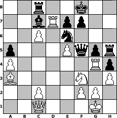 Partie-Notation im PGN-Format [Event "Auf Bobby s Spuren"] [Site "www.mySchach.de"] [Date "2011.09.25"] [Round "2"] [White "Erich"] [Black "Schachfedi"] [Variant "Fischerrandom"] [SetUp "1"] [FEN "bbnqnrkr/pppppppp/8/8/8/8/PPPPPPPP/BBNQNRKR w KQkq - 0 1"] [WhitemyELO "1943"] [BlackmyELO "1804"] [Result "1-0"] [TimeControl "10/2592000"] [WhiteDays "120"] [BlackDays "068"] [MySchachNr "76482"] 1. c4 Nf6 2. b4 c6 3. Nf3 Nb6 4. c5 Nbd5 5. a3 b6 6. d4 h5 7. Qb3 Bb7 8. Rd1 h4 9. h3 Bc7 10. O-O Rh5 11. Rfe1 Nf4 12. Nd3 d5 13. cxd6 Qxd6 14. Nxf4 Qxf4 15. e4 c5 16. dxc5 bxc5 17. bxc5 Bc6 18. Qc3 Rb8 19. Bb2 Qh6 20. e5 Nd5 21. Qd4 Nf4 22. Be4 Bxe4 23. Rxe4 Ne6 24. Qc3 Qg6 25. Rg4 Qf5 26. Qc1 a5 27. c6 Rc8 28. Rd7 Kf8 29. a4 g5 30. Ba3 1-0 Stellungs-Notation im FEN-Format 2r2k2/2bRpp2/2P1n3/p3Pqpr/P5Rp/B4N1P/2P2PP1/2Q3K1 - - - 1 30 Geschlagene Figuren Weiss: Geschlagene Figuren Schwarz: Klicken Sie auf eine geschlagene Figur um den gewünschten Zug darzustellen!
