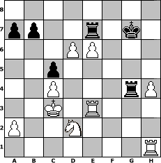 Partie-Notation im PGN-Format [Event "3.Clubmeisterschaft Aljechins Enkel"] [Site "www.mySchach.de"] [Date "2008.03.01"] [Round "1"] [White "wasserandy"] [Black "Knight"] [ECO "E10"] [WhitemyELO "1799"] [BlackmyELO "1115"] [Result "1-0"] [TimeControl "10/3456000"] [WhiteDays "149"] [BlackDays "156"] [MySchachNr "42992"] 1. d4 Nf6 2. c4 e6 3. Nf3 d5 4. Nc3 Bb4 5. cxd5 exd5 6. Qa4+ Nc6 7. Bg5 O-O 8. e3 h6 9. Bh4 Bxc3+ 10. bxc3 Bd7 11. Qc2 Re8 12. Bd3 g5 13. Bg3 Ne4 14. Bxe4 dxe4 15. Nd2 f5 16. Qb3+ Kh7 17. h4 g4 18. Qf7+ Kh8 19. Qg6 Re7 20. Qxh6+ Rh7 21. Qf4 Be6 22. c4 Nb4 23. Qe5+ Rg7 24. Qxe6 Nd3+ 25. Ke2 Qd7 26. Qxd7 Rxd7 27. f3 gxf3+ 28. gxf3 Rg8 29. fxe4 Rxg3 30. Kxd3 f4 31. Rae1 fxe3 32. Rxe3 Rg2 33. e5 c5 34. d5 Rg4 35. e6 Re7 36. Kc3 Kg7 37. d6 1-0 Stellungs-Notation im FEN-Format 8/pp2r1k1/3PP3/2p5/2P3rP/2K1R3/P2N4/7R - - - 0 37 Geschlagene Figuren Weiss: Geschlagene Figuren Schwarz: Klicken Sie auf eine geschlagene Figur um den gewünschten Zug darzustellen!