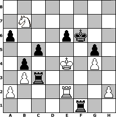 Partie-Notation im PGN-Format [Event "Schach Schach Schach....."] [Site "www.mySchach.de"] [Date "2018.10.23"] [Round "1"] [White "wolni55"] [Black "martinus"] [ECO "B20"] [WhitemyELO "1341"] [BlackmyELO "1687"] [Result "0-1"] [TimeControl "10/2592000"] [WhiteDays "17"] [BlackDays "30"] [MySchachNr "113328"] 1. e4 c5 2. Bc4 e6 3. Nc3 a6 4. Nf3 b5 5. Be2 Bb7 6. d3 b4 7. Na4 d5 8. b3 dxe4 9. dxe4 Qxd1+ 10. Bxd1 Bxe4 11. Bf4 Nc6 12. Nb6 Rd8 13. O-O Nf6 14. Nd2 Bd6 15. Bxd6 Rxd6 16. Nxe4 Nxe4 17. Nc4 Rd7 18. Bf3 f5 19. g4 Nd4 20. Bxe4 fxe4 21. Rac1 Ne2+ 22. Kh1 Nxc1 23. Rxc1 O-O 24. Kg2 Rdf7 25. Rf1 Rd8 26. Ne5 Rf6 27. Nc4 Rd5 28. Re1 Rd4 29. Re2 Rf4 30. Kg3 Rf3+ 31. Kh4 h5 32. Kxh5 Rh3+ 33. Kg5 Rd5+ 34. Kf4 g5+ 35. Kxe4 Rd4+ 36. Ke5 Kf7 37. Nd6+ Ke7 38. Nb7 Rd5+ 39. Ke4 Kf6 40. f3 Re5+ 41. Kd3 Rxf3+ 42. Kd2 Rd5+ 43. Kc1 Rf1+ 44. Kb2 Rdd1 45. c3 Rb1+ 46. Kc2 Rfc1+ 47. Kd3 Rxc3+ 48. Ke4 Rf1 0-1 Stellungs-Notation im FEN-Format 8/1N6/p3pk2/2p3p1/1p2K1P1/1Pr5/P3R2P/5r2 - - - 2 49 Geschlagene Figuren Weiss: Geschlagene Figuren Schwarz: Klicken Sie auf eine geschlagene Figur um den gewünschten Zug darzustellen!