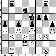 Partie-Notation im PGN-Format [Event "Schach in den Mai"] [Site "www.mySchach.de"] [Date "2008.04.26"] [Round "1"] [White "alpacino"] [Black "Helmut48"] [ECO "C40"] [WhitemyELO "1332"] [BlackmyELO "1335"] [Result "1/2-1/2"] [TimeControl "10/864000"] [WhiteDays "38"] [BlackDays "38"] [MySchachNr "44507"] 1. e4 e5 2. Nf3 f6 3. Bc4 a6 4. O-O Nc6 5. Nh4 g6 6. Nf5 d6 7. c3 Nge7 8. Nxe7 Qxe7 9. d3 Be6 10. Bd5 Bxd5 11. exd5 Nb8 12. Qa4+ Qd7 13. Qxd7+ Nxd7 14. Nd2 c6 15. dxc6 bxc6 16. Nc4 a5 17. Re1 Be7 18. Bh6 Bf8 19. Bxf8 Rxf8 20. Nxd6+ Ke7 21. Ne4 Rab8 22. b3 c5 23. c4 h5 24. h3 Rbc8 25. f3 Nb8 26. a3 Rfd8 27. Red1 Rd7 28. Rd2 Rb7 29. Rb1 Nd7 30. a4 Ke6 31. h4 Rg8 32. g3 Rbb8 1/2-1/2 Stellungs-Notation im FEN-Format 1r4r1/3n4/4kpp1/p1p1p2p/P1P1N2P/1P1P1PP1/3RP3/1R4K1 - - - 1 33 Geschlagene Figuren Weiss: Geschlagene Figuren Schwarz: Klicken Sie auf eine geschlagene Figur um den gewünschten Zug darzustellen!