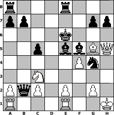 Partie-Notation im PGN-Format [Event "m"] [Site "www.mySchach.de"] [Date "2007.02.22"] [Round "1"] [White "UPS"] [Black "ujack1961"] [ECO "C45"] [WhitemyELO "1732"] [BlackmyELO "1892"] [Result "0-1"] [TimeControl "10/864000"] [WhiteDays "00"] [BlackDays "30"] [MySchachNr "32725"] 1. e4 e5 2. Nf3 Nc6 3. d4 exd4 4. Nxd4 Nxd4 5. Qxd4 d6 6. Nc3 Nf6 7. Bc4 Be7 8. O-O O-O 9. e5 dxe5 10. Qxe5 Re8 11. Be3 Bd6 12. Qd4 Bf5 13. Bb3 c5 14. Qh4 Ng4 15. Bxf7+ Kxf7 16. Qh5+ Ke6 17. Bg5 Bxh2+ 18. Kh1 Qb6 19. Rfe1+ Be5 20. f4 Qxb2 0-1 Stellungs-Notation im FEN-Format r3r3/pp4pp/4k3/2p1bbBQ/5Pn1/2N5/PqP1P1P1/R3R2K - - - 0 21 Geschlagene Figuren Weiss: Geschlagene Figuren Schwarz: Klicken Sie auf eine geschlagene Figur um den gewünschten Zug darzustellen!