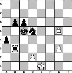 Partie-Notation im PGN-Format [Event "f"] [Site "www.mySchach.de"] [Date "2008.04.14"] [Round "1"] [White "Master1"] [Black "commander"] [ECO "A40"] [WhitemyELO "1311"] [BlackmyELO "1210"] [Result "0-1"] [TimeControl "10/864000"] [WhiteDays "22"] [BlackDays "30"] [MySchachNr "44270"] 1. d4 Nc6 2. e4 Nxd4 3. Qxd4 Nf6 4. Nc3 d6 5. e5 dxe5 6. Qxd8+ Kxd8 7. Bg5 Nh5 8. Nd5 f6 9. Bh4 Be6 10. Ne3 Nf4 11. O-O-O+ Bd7 12. g3 Ng6 13. Bh3 c6 14. Rxd7+ Kc8 15. Rd1+ Kc7 16. Ne2 a6 17. f4 exf4 18. Nxf4 Ne5 19. Ne6+ Kb6 20. Rd8 Rxd8 21. Nxd8 g5 22. Bxg5 fxg5 23. Ne6 h5 24. Bg2 g4 25. Nxf8 Rxf8 26. b3 Rf2 27. Rf1 Re2 28. Nc4+ Nxc4 29. Rg1 Na3 30. h3 Rxc2+ 31. Kd1 Rxa2 32. hxg4 hxg4 33. Re1 Rxg2 34. Re3 Nc2 35. Rxe7 Nb4 36. Re3 Nd5 37. Rd3 Nb4 38. Re3 Kb5 39. Rc3 b6 40. Ke1 Nd5 41. Rd3 Kb4 42. Kf1 Rb2 43. Ke1 Rxb3 44. Rd4+ Kc5 45. Rxg4 a5 46. Rg5 a4 0-1 Stellungs-Notation im FEN-Format 8/8/1pp5/2kn2R1/p7/1r4P1/3P4/4K3 - - - 0 47 Geschlagene Figuren Weiss: Geschlagene Figuren Schwarz: Klicken Sie auf eine geschlagene Figur um den gewünschten Zug darzustellen!