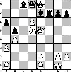Partie-Notation im PGN-Format [Event "7er"] [Site "www.mySchach.de"] [Date "2010.04.18"] [Round "1"] [White "BobbyF4"] [Black "Haki"] [ECO "C00"] [WhitemyELO "1556"] [BlackmyELO "1227"] [Result "1-0"] [TimeControl "10/2592000"] [WhiteDays "21"] [BlackDays "30"] [MySchachNr "64948"] 1. e4 e6 2. f4 e5 3. Bc4 exf4 4. Nf3 f6 5. O-O Nc6 6. d4 Bd6 7. Bd2 Nge7 8. a3 b6 9. b4 a6 10. Re1 b5 11. Bb3 Nxd4 12. Ba2 Nxf3+ 13. Qxf3 Ng6 14. e5 fxe5 15. Qxa8 c6 16. Qa7 Ne7 17. Qf2 Nd5 18. c4 Nf6 19. c5 Be7 20. Bxf4 exf4 21. Qxf4 Nd5 22. Bxd5 cxd5 23. Nc3 Rf8 24. Qe5 Rf7 25. Nxd5 d6 26. cxd6 1-0 Stellungs-Notation im FEN-Format 2bqk3/4brpp/p2P4/1p1NQ3/1P6/P7/4P1PP/R3R1K1 - - - 0 26 Geschlagene Figuren Weiss: Geschlagene Figuren Schwarz: Klicken Sie auf eine geschlagene Figur um den gewünschten Zug darzustellen!