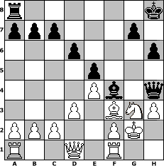 Partie-Notation im PGN-Format [Event "850 Jahre M"] [Site "www.mySchach.de"] [Date "2008.08.10"] [Round "1"] [White "freizeitspieler"] [Black "Robur"] [ECO "B02"] [WhitemyELO "1645"] [BlackmyELO "1720"] [Result "1-0"] [TimeControl "10/2592000"] [WhiteDays "59"] [BlackDays "00"] [MySchachNr "46965"] 1. e4 Nf6 2. Nc3 e5 3. Bc4 d6 4. d3 Nbd7 5. Bg5 Be7 6. Nf3 O-O 7. Qd2 h6 8. Bxf6 Nxf6 9. h3 Re8 10. O-O Nh5 11. Ne2 Kh8 12. Bxf7 Rf8 13. Bxh5 Bxh3 14. gxh3 Rxf3 15. Bxf3 Bg5 16. Qd1 Bf4 17. Ng3 Qh4 18. Kg2 1-0 Stellungs-Notation im FEN-Format r6k/ppp3p1/3p3p/4p3/4Pb1q/3P1BNP/PPP2PK1/R2Q1R2 - - - 6 18 Geschlagene Figuren Weiss: Geschlagene Figuren Schwarz: Klicken Sie auf eine geschlagene Figur um den gewünschten Zug darzustellen!