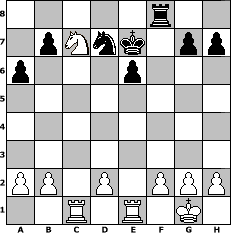 Partie-Notation im PGN-Format [Event "Mit Dame Gambit ins Fr"] [Site "www.mySchach.de"] [Date "2006.01.31"] [Round "2"] [White "sleepers"] [Black "Andylein1989"] [ECO "D10"] [WhitemyELO "1639"] [BlackmyELO "1368"] [Result "1-0"] [TimeControl "10/864000"] [WhiteDays "10"] [BlackDays "10"] [MySchachNr "22150"] 1. d4 d5 2. c4 c6 3. cxd5 cxd5 4. e3 Nf6 5. Nc3 Nc6 6. Nf3 Bf5 7. Bd3 Qd7 8. O-O Nb4 9. Bb5 Nc6 10. Ne5 Qc7 11. Qa4 Bd7 12. e4 Nxe5 13. dxe5 Qxe5 14. exd5 Qd6 15. Rd1 a6 16. Bf4 Bxb5 17. Nxb5 Qd7 18. Nc7+ Kd8 19. Qxd7+ Nxd7 20. Nxa8 e5 21. dxe6 fxe6 22. Bg5+ Be7 23. Bxe7+ Kxe7 24. Nc7 Rc8 25. Rac1 Rf8 26. Re1 1-0 Stellungs-Notation im FEN-Format 5r2/1pNnk1pp/p3p3/8/8/8/PP1P1PPP/2R1R1K1 - - - 5 26 Geschlagene Figuren Weiss: ![]() ![]() ![]() ![]() ![]() ![]() ![]() ![]() ![]() ![]() ![]() ![]() ![]() ![]() ![]() Geschlagene Figuren Schwarz: ![]() ![]() ![]() ![]() ![]() ![]() ![]() ![]() ![]() ![]() ![]() ![]() ![]() ![]() ![]() Klicken Sie auf eine geschlagene Figur um den gewünschten Zug darzustellen!