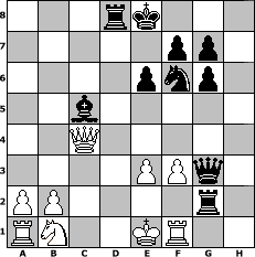 Partie-Notation im PGN-Format [Event "Die Wikinger XXI. - Qualifikation"] [Site "www.mySchach.de"] [Date "2025.08.08"] [Round "1"] [White "Seneca"] [Black "jeremyt"] [ECO "D00"] [WhitemyELO "1528"] [BlackmyELO "2104"] [Result "0-1"] [TimeControl "10/2592000"] [WhiteDays "30"] [BlackDays "30"] [MySchachNr "133570"] 1. d4 d5 2. e3 Nf6 3. Nf3 a6 4. Be2 Bf5 5. O-O e6 6. Nh4 Be4 7. f3 Bg6 8. Nxg6 hxg6 9. c4 dxc4 10. Bxc4 c5 11. Qa4+ Nc6 12. Bd2 b5 13. Bxb5 axb5 14. Qxb5 Qc7 15. Bc3 cxd4 16. Bxd4 Rh5 17. Qb6 Qxh2+ 18. Kf2 Nxd4 19. Qxd4 Bc5 20. Qc4 Rg5 21. Qc3 Rxg2+ 22. Ke1 Rd8 23. Qc4 Qg3+ 0-1 Stellungs-Notation im FEN-Format 3rk3/5pp1/4pnp1/2b5/2Q5/4PPq1/PP4r1/RN2KR2 - - - 4 24 Geschlagene Figuren Weiss: Geschlagene Figuren Schwarz: Klicken Sie auf eine geschlagene Figur um den gewünschten Zug darzustellen!