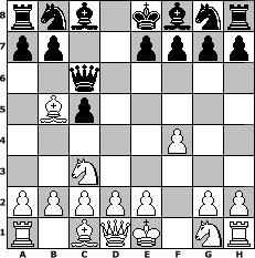Partie-Notation im PGN-Format [Event "Grand Prix Angriff "] [Site "www.mySchach.de"] [Date "2016.11.29"] [Round "1"] [White "reisinger"] [Black "Knight"] [ECO "B21"] [WhitemyELO "1474"] [BlackmyELO "1245"] [Result "1-0"] [TimeControl "10/2592000"] [WhiteDays "28"] [BlackDays "30"] [MySchachNr "105880"] 1. e4 c5 2. f4 d5 3. exd5 Qxd5 4. Nc3 Qc6 5. Bb5 1-0 Stellungs-Notation im FEN-Format rnb1kbnr/pp2pppp/2q5/1Bp5/5P2/2N5/PPPPP1PP/R1BQK1NR - KQkq - 3 5 Geschlagene Figuren Weiss: Geschlagene Figuren Schwarz: Klicken Sie auf eine geschlagene Figur um den gewünschten Zug darzustellen!