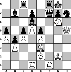 Partie-Notation im PGN-Format [Event "Die verr"] [Site "www.mySchach.de"] [Date "2012.05.01"] [Round "1"] [White "Erich"] [Black "Peterlie77 (C)"] [Variant "Fischerrandom"] [SetUp "1"] [FEN "bbqnrnkr/pppppppp/8/8/8/8/PPPPPPPP/BBQNRNKR w KQkq - 0 1"] [WhitemyELO "2030"] [BlackmyELO "2010"] [Result "1-0"] [TimeControl "10/2592000"] [WhiteDays "30"] [BlackDays "28"] [MySchachNr "81375"] 1. d4 c5 2. d5 b5 3. e4 Ng6 4. Nde3 f6 5. b3 Nf7 6. Nd2 e6 7. c4 b4 8. g3 Bb7 9. f4 e5 10. f5 Ne7 11. O-O O-O 12. a3 a5 13. Bd3 Ba7 14. a4 Qc7 15. Qd1 Qd6 16. Bb2 Bb6 17. Kg2 Ba7 18. h3 Bb8 19. Bc1 Bc7 20. Qh5 Ba8 21. Be2 Qb6 22. Nf3 Nd6 23. Bd3 Nf7 24. Ng4 Bb7 25. Nh4 Rd8 26. Be3 Bc8 27. Rd1 Qd6 28. Be2 Bb8 29. Ng6 Rfe8 30. Nh2 Bb7 31. g4 Rc8 32. h4 hxg6 33. fxg6 Nxg6 34. Qxg6 Nh8 35. Qf5 Rf8 36. h5 Qe7 37. Nf3 Nf7 38. Nh4 Nd6 39. Qf3 Qf7 40. Ng6 Rfd8 41. g5 Ne8 42. gxf6 Nxf6 43. Qf5 Bd6 44. h6 Rf8 45. h7+ Nxh7 46. Qh5 1-0 Stellungs-Notation im FEN-Format 2r2rk1/1b1p1qpn/3b2N1/p1pPp2Q/PpP1P3/1P2B3/4B1K1/3R1R2 - - - 1 46 Geschlagene Figuren Weiss: Geschlagene Figuren Schwarz: Klicken Sie auf eine geschlagene Figur um den gewünschten Zug darzustellen!